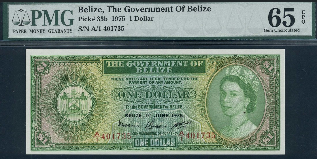 Government of Belize, $1, 1 June 1975, serial number A/1 401735, green on multicolour underprint, Elizabeth II at right, arms at left, value at centre and each corner