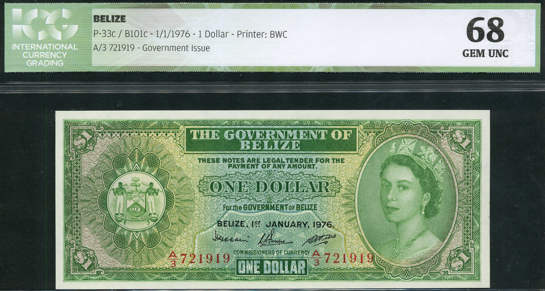 Government of Belize, $1 (2), 1 January 1976, serial numbers A/3 721919 and A/4 339437, green on multicolour underprint, Elizabeth II at right, arms at left