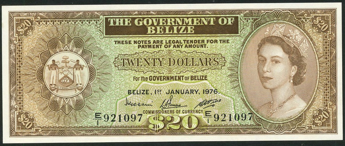 Government of Belize, $20, 1 January 1976, serial number E/1 921097, brown and pale green, Elizabeth II at right, arms at left, Cain, Fonseca and Cattouse signatures low centre, reverse brown and multicoloured