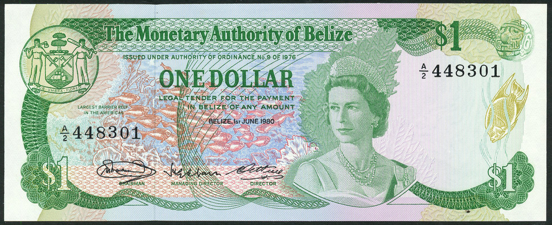 Monetary Authority of Belize, $1 (5), 1 June 1980, serial number A/2 448301/302/303/304/305, green and multicoloured, arms top left, fish and reef at centre, Elizabeth II at right centre wearing tiara, Marshalleck, Cain and Cattouse signatures, reverse House of Assembly building in Belmopan, Jabiru stork at right, Angel fish and Green Iguana at left
