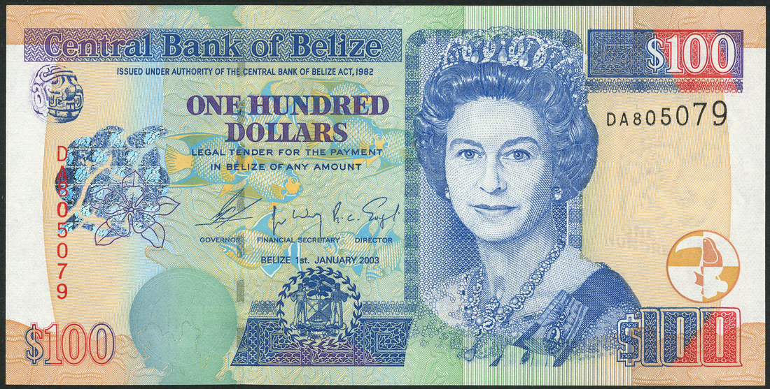Monetary Authority of Belize, $5, 1 June 1980, serial number J/2 295249, red on multicolour underprint, portrait Queen Elizabeth II at centre right, coat of arms top left, shoal of fish and coral at centre, angel fish at right, reverse, National Assembly Building at centre, also Central Bank of Belize, $100, 1 January 2003, serial number DA805079, grey-blue and multicolour, portrait Queen Elizabeth II at centre right, tropical fish at centre, coat of arms low centre, reverse, multicolour, toucan and tapir in panel at centre left, birds centre and right