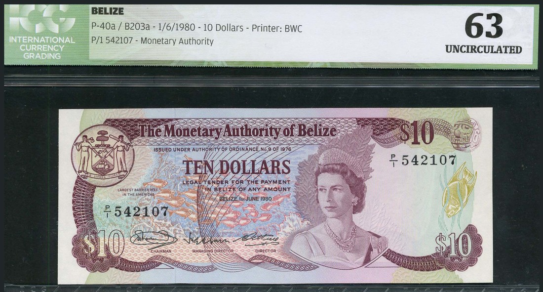 Monetary Authority of Belize, $10 (3), 1 June1980, serial numbers P/1 542106/107/108, purple and multicoloured, arms top left, fish and reef at centre, Elizabeth II at right centre wearing tiara, Marshalleck, Cain and Cattouse signatures, reverse purple, the House of Assembly building in Belmopan, Jabiru stork at right, Angel fish and Green Iguana at left