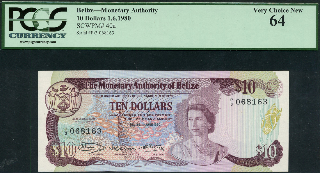 (x) Monetary Authority of Belize, $10, 1 June 1980, serial number P/3 068163, maroon on multicolour underprint, Elizabeth II at right, arms at top left, fish at centre and right