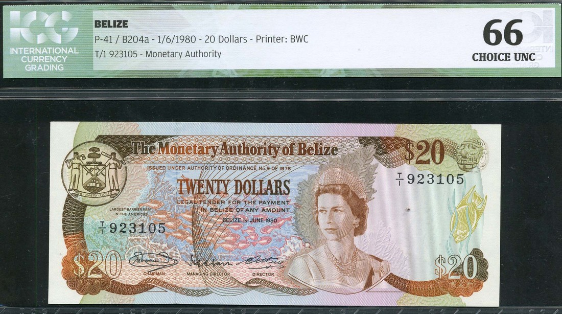Monetary Authority of Belize, $20 (2), 1 June 1980, serial number T/1 923104/105, brown on multicolour underprint, portrait Queen Elizabeth II centre right, coat of arms top left, school of fish and coral at centre, angel fish at left, Marshalleck, Cain and Cattouse signatures, reverse, brown, purple and pale green, National Assembly Building at centre, angel fish and iguana at left, Jabiru stork at right