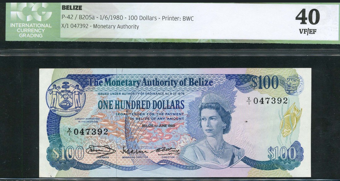 Monetary Authority of Belize, $100, 1 June1980, serial number X/1 047392, blue, arms top left, fish and reef at centre, Elizabeth II at right centre wearing tiara, Marshalleck, Cain and Cattouse signatures, reverse House of Assembly building in Belmopan, Jabiru stork at right, Angel fish and Green Iguana at left