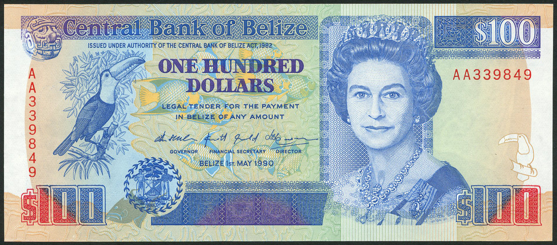 Central Bank of Belize, a set of the 1 May 1990 series comprising $1, 2, 5, 10, 20, 50 and $100, all Elizabeth II at right and signatures of Slusher, Arnold and Courtenay
