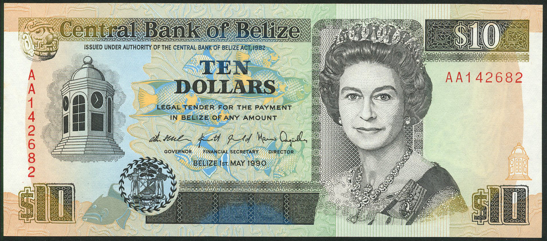 Central Bank of Belize, $1, $2, $5, $10 (2), $20, 1990/1991, serial numbers AA652588, AA322249, AA062710, AA142682, AC750615 and AC202918 respectively, a bright and colourful set all depicting Queen Elizabeth II at right, tropical fish at centre, reverse, underwater scene, Maya Ruins, St George's Caye and Government House respectively