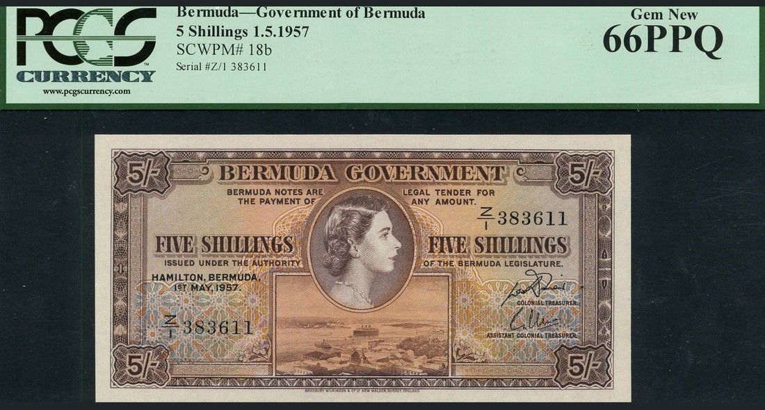 (x) Bermuda Government, 5 shillings, 1 May 1957, serial number Z/1 383611, brown and orange on multicolour underprint, portrait Queen Elizabeth II at centre, view of Bermuda low centre, reverse, coat of arms flanked by value in ornate frames