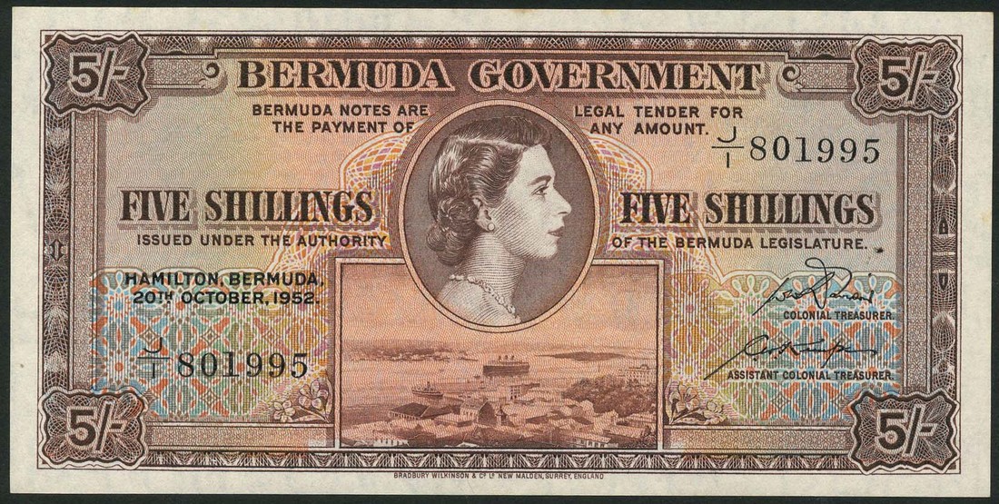 Bermuda Government, 5 shillings, 20 October 1952, serial number J/1801995, brown and purple, portrait Queen Elizabeth II at centre, view of Hamilton harbour low centre, reverse, brown, pink and olive green, Royal crest flanked by value, also, 10 shillings, 20 October 1952, serial number F/1 542003, red and multicolour, portrait Queen Elizabeth II at centre, Gate's Fort in St George low centre, reverse, Royal crest in ornate panel with value at left and right and at low centre