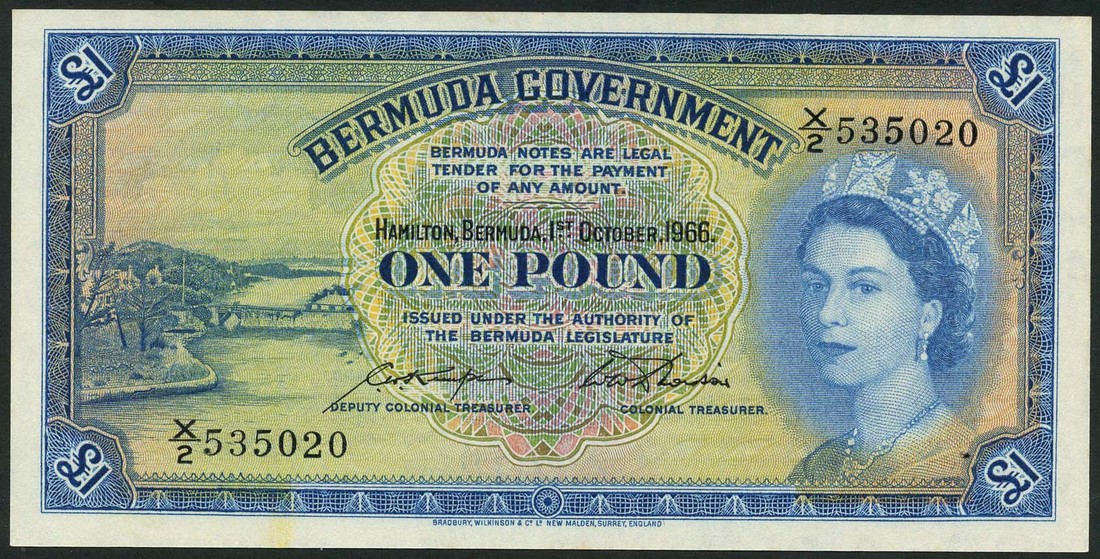 Bermuda Government, £1, 1 October 1966, serial number X/2 535020, blue on multicolour underprint, portrait Queen Elizabeth II at right, Somerset Bridge at Sandys Parish at left, reverse, dark blue, turquoise and pale orange, Royal Crest in ornate frame at centre flanked by value