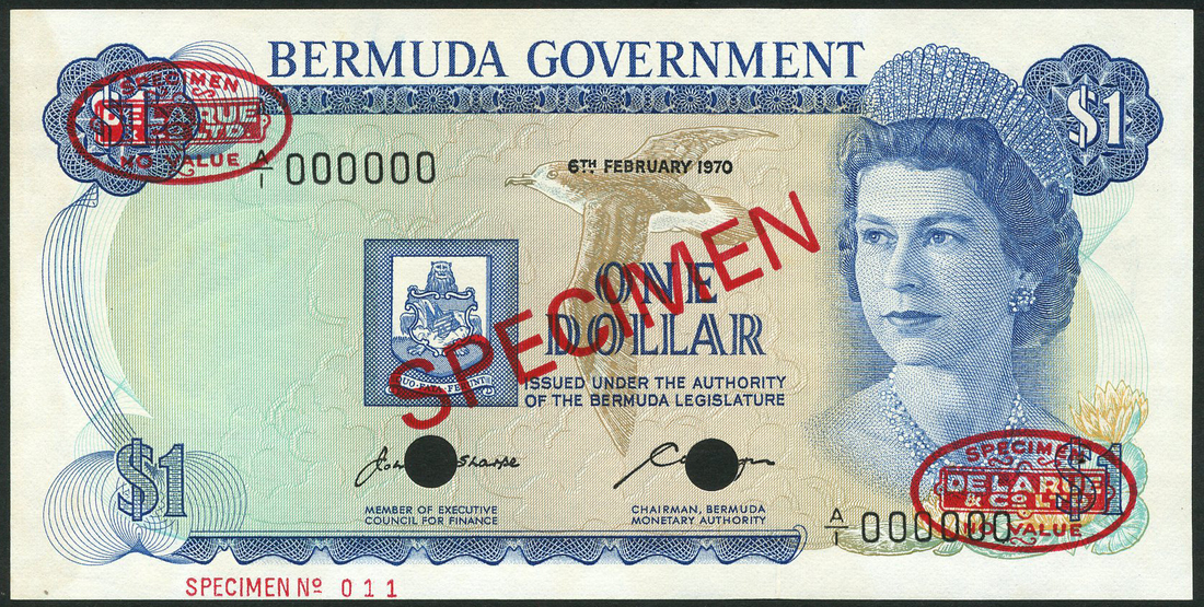Bermuda Government, specimen $1, 6 February 1970, serial number A/1 000000, also, $1 (8), 1970 (3), 1975, 1978, 1984, 1986, 1988, all blue on multicolour underprint, portrait Queen Elizabeth II at right, coat of arms centre left, Bermuda petrel in background, water lily flowers low right, reverse, two Bermuda sailboats, Hamilton scene top right