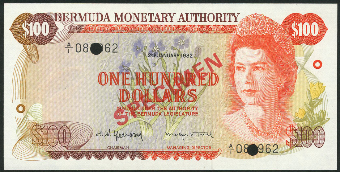 Bermuda Monetary Authority, specimen $1, $5, $10 (2), $20, $50 (2), $100, blue and olive green, red and green, purple, green and pink, green red and light blue, brown, orange brown and green respectively, all feature portrait Queen Elizabeth II at right and Bermudan scenes on reverse