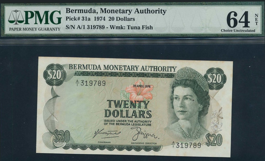 Bermuda Monetary Authority, $20, 1 April 1974, serial number A/1 319789, green, red and light blue, portrait Queen Elizabeth II at right, hibiscus flower at centre, lily flower low right, value in each corner and at centre, reverse, Somerset Bridge at Sandys Parish, boat at centre, arms top left