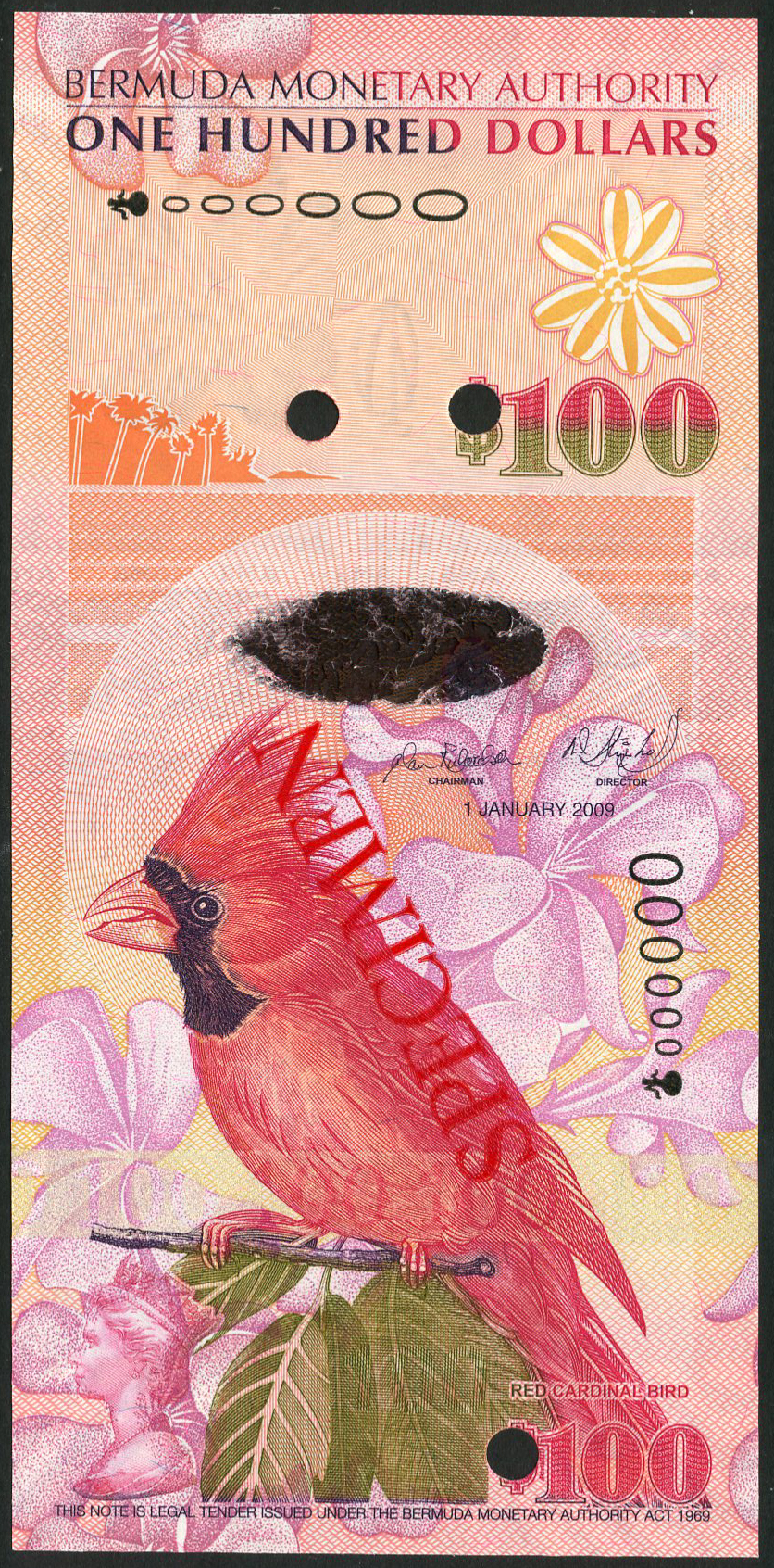 (x) Bermuda Monetary Authority, specimen set of the 2009 issue, comprising $2, $5, $10, $20, $50 and $100, all serial number 000000, multicoloured, wonderful images of native birds, fish and frogs, reverse with buildings of Bermuda, three cancellation holes and red SPECIMEN overprints