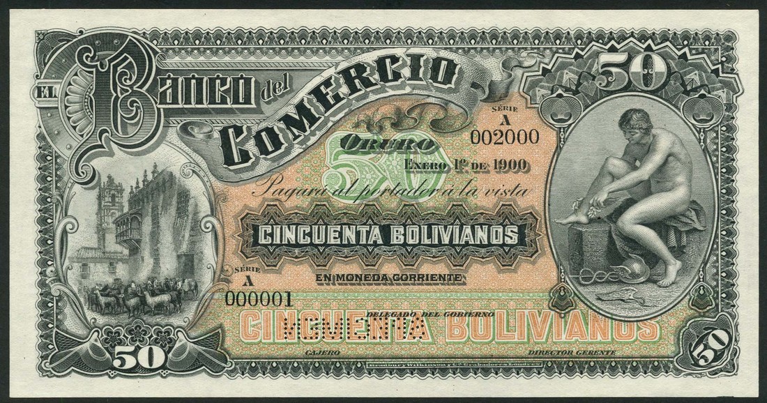(x) El Banco del Commercio, Bolivia, specimen 50 bolivianos, Oruro, 1 January 1900, serial number A00001-A002000, black, pink and green, Mercury at right, llamas in a Potosi street at left, reverse brown and pale yellow, arms at centre, value at left and right