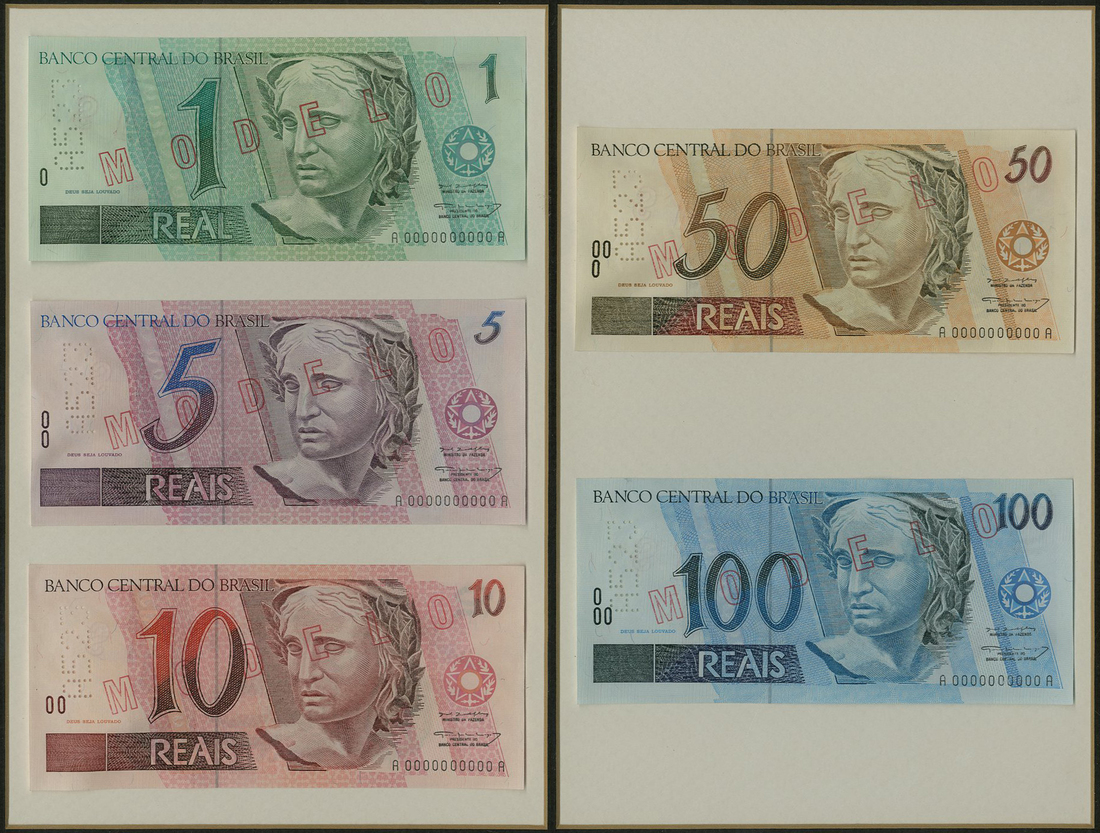 Banco Central do Brasil, a full specimen set from the 1994 issue comprising 1 real, green, 5 reais, violet, 10 reais, pink, 50 reais, brown, 100 reais, blue, all with zero serial number, head of republica and arms at right, red hollow SPECIMEN overprint, perforated