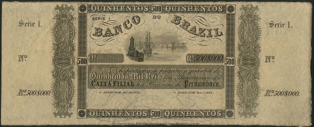 (†) Banco do Brazil, specimen/proof 500 mil reis, Pernambuco, ND (1856), uniface, black on tan paper, harbour and lighthouse view at top centre, value at upper and lower centre, and at left and right