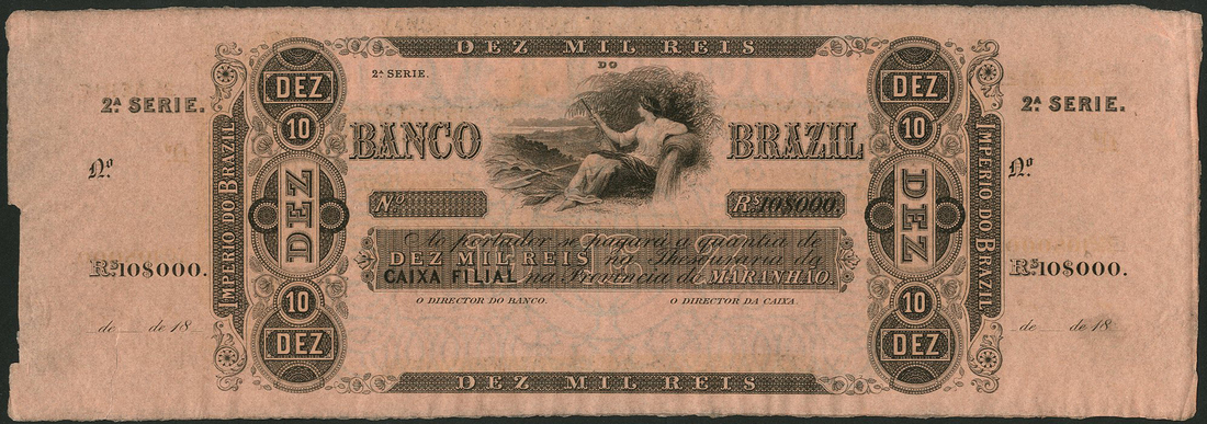 (†) Banco de Brazil, specimen 10 mil reis, Maranhao, ND (1856), no serial number, 2A serie, black and salmon pink paper, allegorical maiden top centre, value at centre, left and right