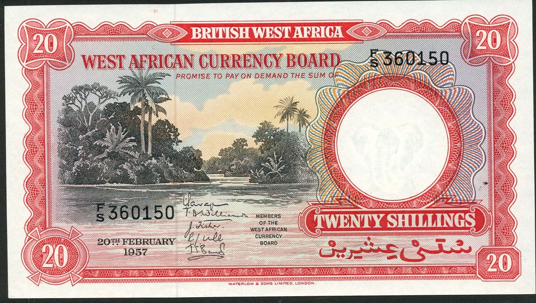 (†) West African Currency Board, 20 Shillings (2), 20 February 1957, consecutive serial numbers F/S 360149/50, red and black, river scene with palm trees, reverse five workers harvesting cacao pods