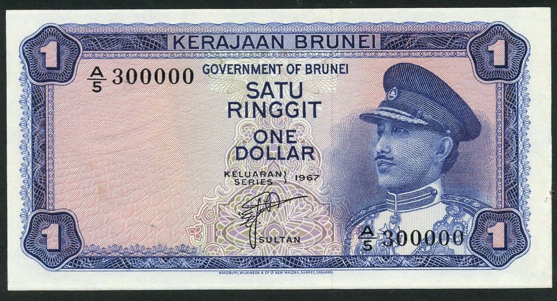 (x) Government of Brunei, a group of $1, 1967, (7), serial number A/1 500000, A/4 888888, A/4 999999, A/5 099999, A/5 100000, A/5 222222, A/5 300000, blue on multicolour, sultan Omar Ali Saifuddin III at right, $1, 1976, serial number A/13 555555, A/14 111111, Sultan Hasanal Bolkiah Mu'Izzaddin Waddaulah at right