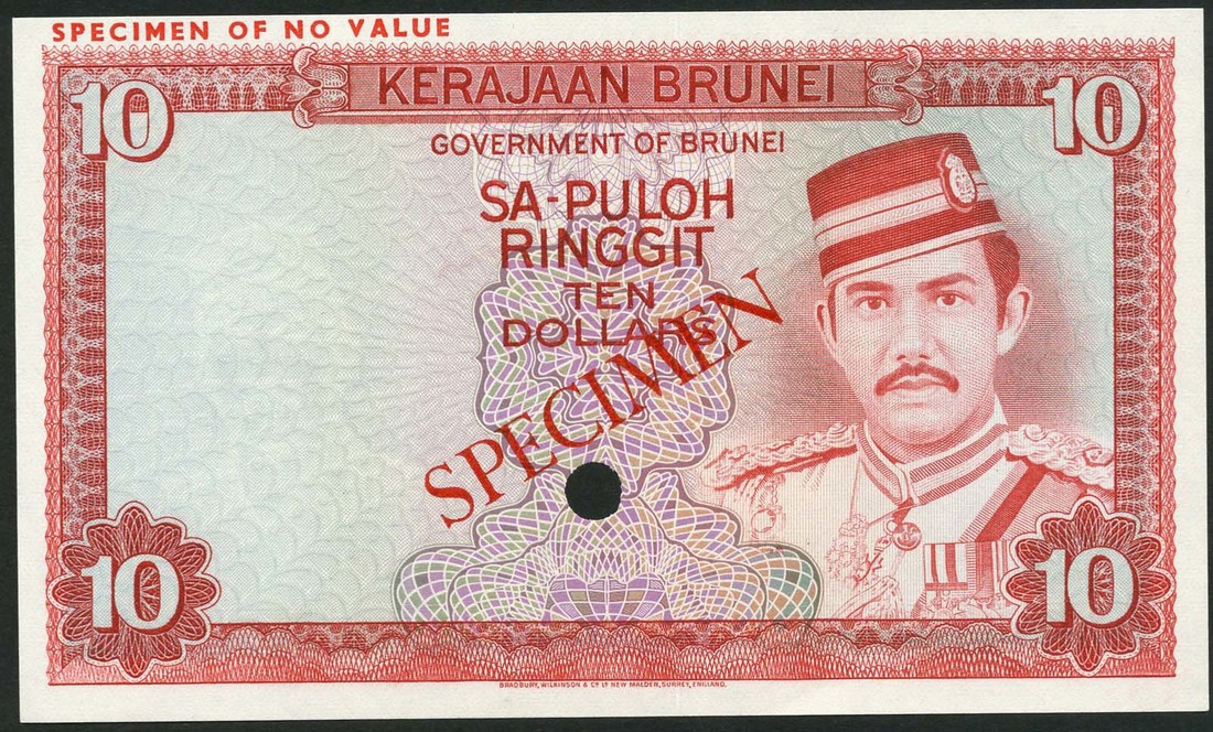 (†) Government of Brunei, a group of specimens of the ND (1972) series, all Sultan Hassanal Bolkiah at right, reverse Omar Ali Saifuddin Mosque, comprising specimen colour trial 1 Ringgit, brown; specimen 1 Ringgit, blue; specimen 5 Ringgit, green; specimen 10 Ringgit, red, all overprinted SPECIMEN in red on obverse and reverse, one punch hole