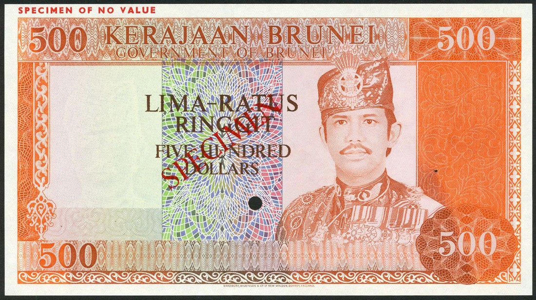 (†) Government of Brunei, specimen 100 Ringgit, purple and blue, ND (ca 1972); also specimen 500 Ringgit, ND (ca 1979), orange and multicoloured, both Sultan Hassanal Bolkiah I at right, reverse Omar Ali Saifuddin Mosque, both overprinted SPECIMEN in red on obverse and reverse, one punch hole