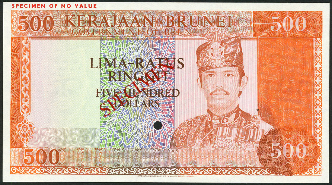 (†) Government of Brunei, specimen 500 Ringgit, ND (ca 1979), orange and multicoloured, Sultan Hassanal Bolkiah I at right, reverse Omar Ali Saifuddin Mosque, overprinted SPECIMEN diagonally in red on obverse and reverse, one punch hole