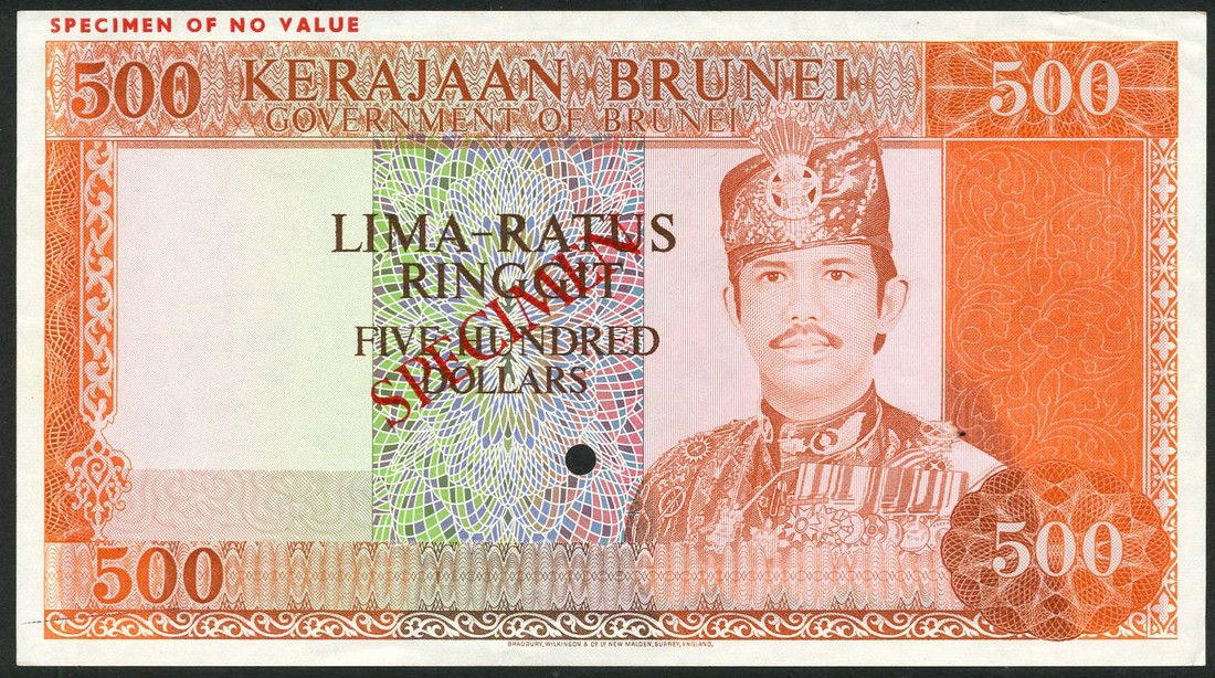 Government of Brunei, specimen 500 Ringgit, ND (ca 1979), orange on multicoloured underprint, Sultan Hassanal Bolkiah I at right, reverse Omar Ali Saifuddin Mosque, overprinted SPECIMEN diagonally in red on obverse and reverse, one punch hole