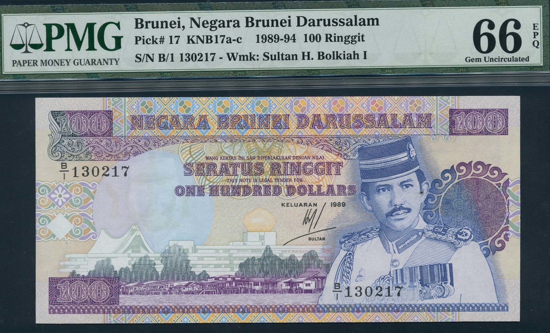 Negara Brunei Darussalam, 100 ringgit, 1989, serial number B/1 130217, blue and violet on multicolour, Sultan H Bolkiah at right, Istana Nurul Iman Palace in background, reverse, view of village along Brunei river
