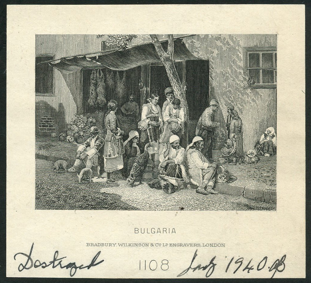 (x) Bulgaria, a group of Bradbury Wilkinson die proof vignettes comprising farm girl carrying roses, farmer ploughing with two horses portrayed on the issues of 1890 and vignettes from American Banknote Company depicting the port of Varna and ploughman, mostly likely on shares certificates