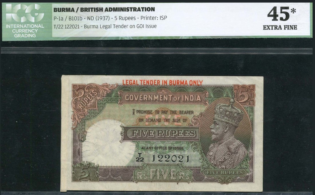 Reserve Bank of India, Burma, 5 rupees, ND (1937), serial number T22 122021,