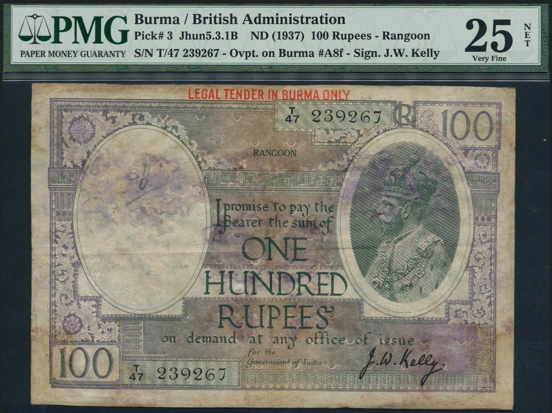 (x) Government of India, Burma issue, 100 rupees, Rangoon, ND (1937), serial number T/47 239267, purple and green, George V at right, value at top right and low left, red LEGAL ENDER IN BURMA ONLY overprint