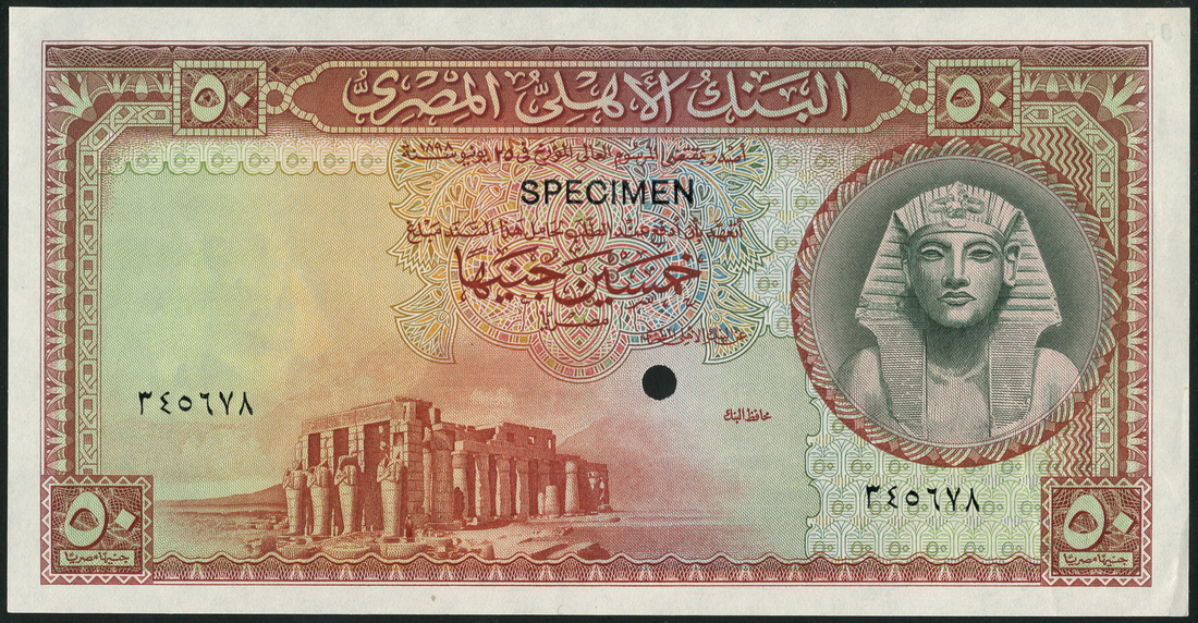 (†) National Bank of Egypt, colour trial 50 pounds, ND (1952), serial number 345678 brown and multicoloured, Tutankhamen at right, the Ramesseum temple at Luxor at left, reverse brown and pale blue, view of Cairo at centre, value at left and right and low centre, perforated