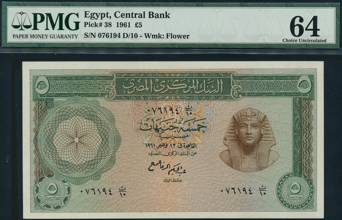 Central Bank of Egypt, £5 (2), 1961, serial numbers D/1 054148 and D/10 076194, green on multicolour, Tutankhamen at right, reverse green, values in guilloche pattern, A.El-Refay signature