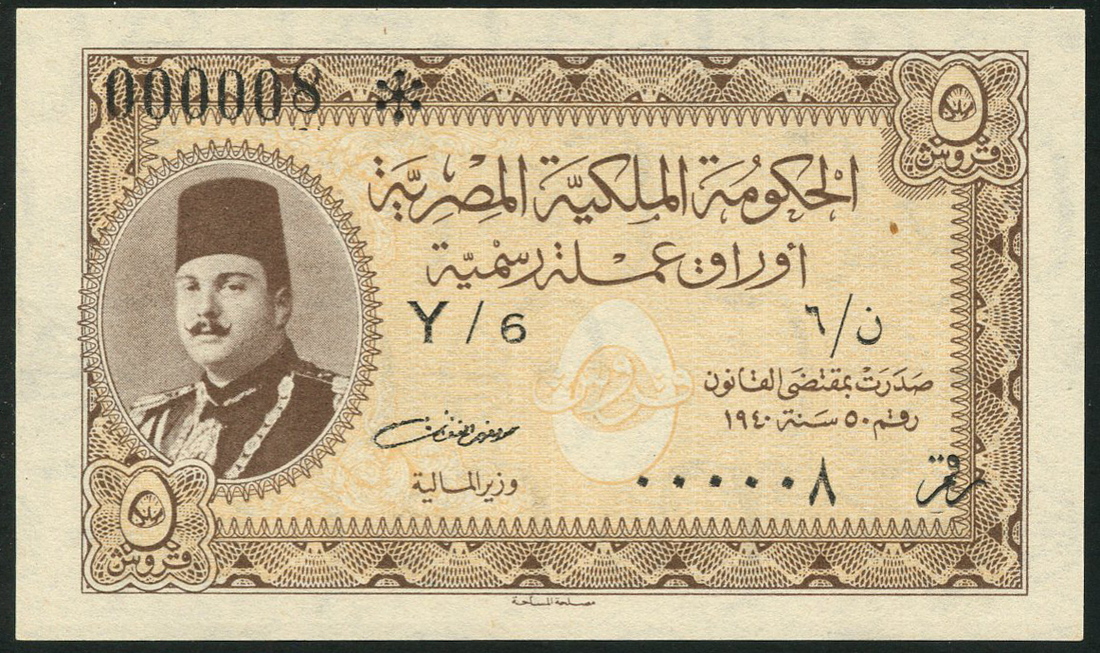 Egyptian Government Currency Note, 5 piastres, 1940, serial number Y/6 000008, brown on tan underprint, King Farouk at left, value at low left and top right, reverse dark blue, F.El Nokrashy signature