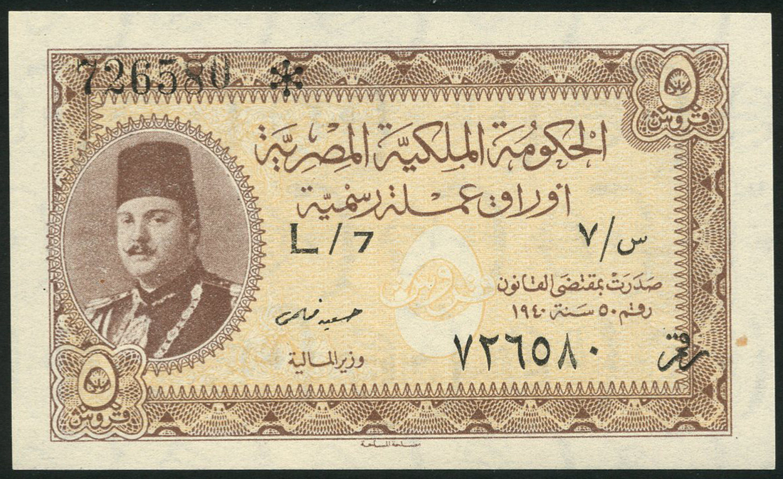 Egyptian Government Currency notes, 5 piastres, 1945, brown, El Bialy signature, and 10 piastres, 1945, blue and green, El Bialy signature, both King Farouk at right, 5 piastres (14), lilac, Nefertiti at right, Abou Ismail, Abdul Meguid, A Loufy, Salah Hamid signatures, 10 piastres (6), brown, people with flag at right, Abou Ismail, A.Loutfy, Salah Hamad signatures