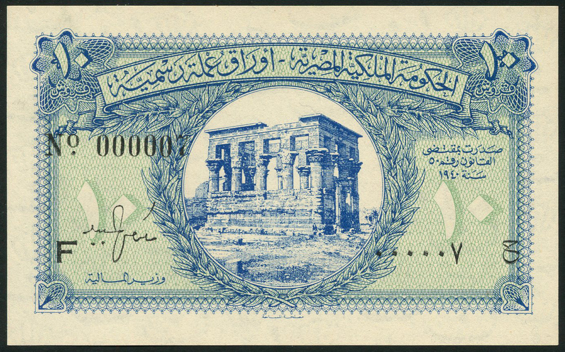 Egyptian Royal Government Currency Note, 10 piastres, law of 1940 (1942), serial number 000007, blue on green underprint, Temple of Philae at centre, value at left and right and each corner, reverse green and pink, value at low left and right, M.Ebaid signature