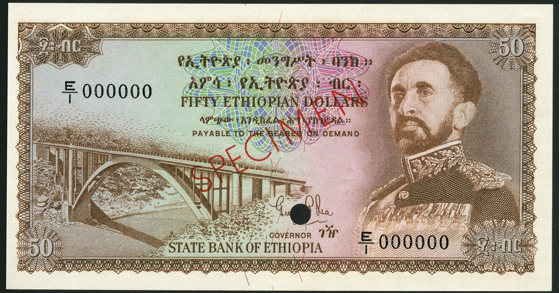 (†) State Bank of Ethiopia, a group of colour trials, ND (1961), all 000000 serial numbers, comprising 5 Dollars, prefix B/1, blue; 10 Dollars, prefix C/1, purple, 20 Dollars, prefix D/1, olive-green; 50 Dollars, prefix E/1, brown; 500 Dollars, prefix G/1, red, all Emperor Haile Selassie at right, reverse crowned arms of the Lion of Judah, all overprinted SPECIMEN in red or black on obverse and reverse, one punch hole