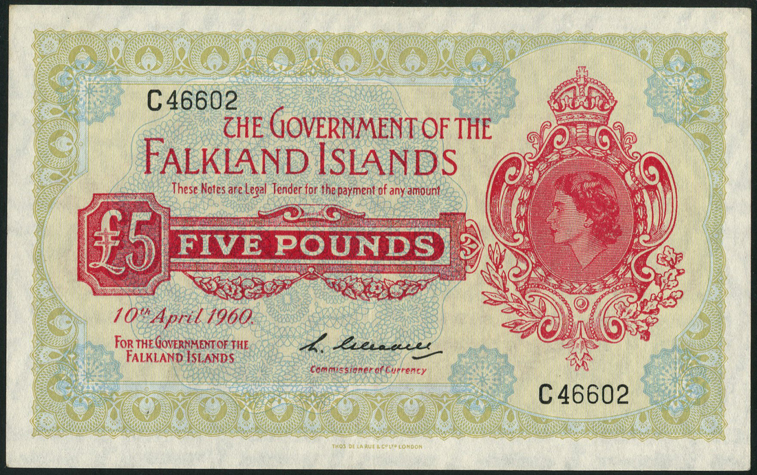 Government of the Falkland Islands, £5, 10 April 1960, serial number C 46602, green, vignette of George VI at left in red, value in red tablet at centre, Leslie Charles Gleadle signature low centre, reverse pale pink
