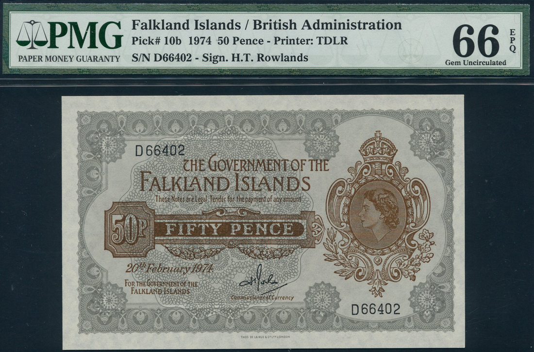 Government of the Falkland Islands, 50 pence, 20 February 1974, serial number D66402, £1, 1 January 1982, serial number F50346, brown and green respectively, both feature portrait Queen Elizabeth II at right, value in tablet at centre left, reverse, guilloche pattern
