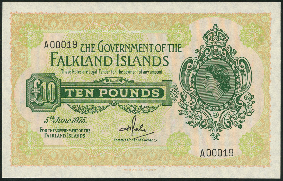 (x) Government of the Falkland Islands, £10, 5 June 1975, serial number A 00019, green and pale orange, Elizabeth II at right, value left centre, reverse green, guilloche pattern, H.T Rowlands signature