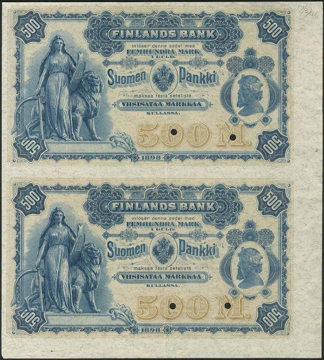(†) Finlands Bank, a pair of specimen/proofs for 500 markaa, ND (1898), blue on tan underprint, armed woman with lion at left, King in profile at right, arms at centre, value at low right and each corner