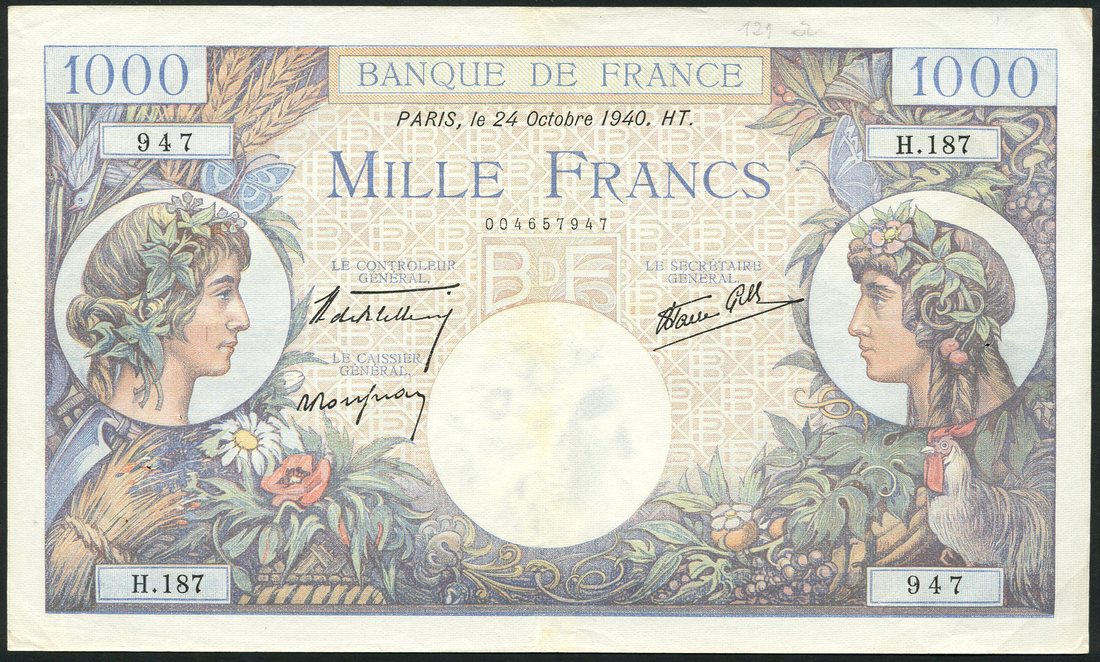 Banque de France, an interesting collection including 1000 francs, 1942, serial number Z.1883615, uncirculated, 1000 francs, 1927 and 1940, 50 francs, 1929, 20 francs 1941 (2) including the propaganda issues with Petain and Hitler in fishermans noose, 10 francs 1949, 5 francs 1943, 500 and 1000 francs from the 1945-49, WWII Tresor Central, 100 francs, (Pick 79, 80, 92, 96, 98, 99f, 129, 130) and a large group of Chambre De Commerce De Paris,