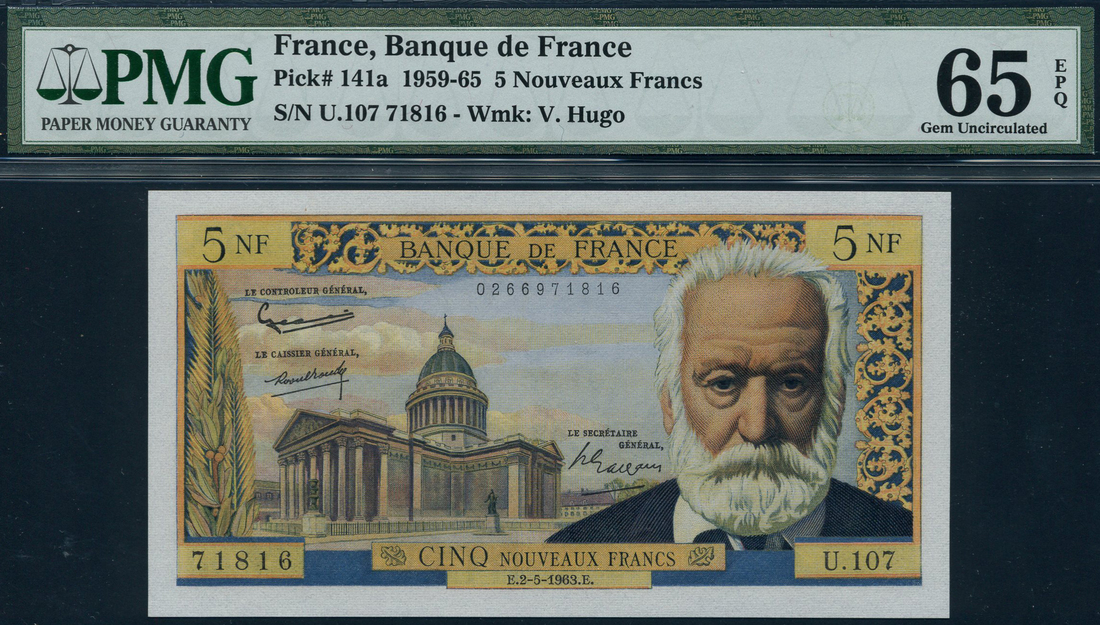 Banque de France, 5 Nouveaux francs, ND (1959-65), serial number U.127 99907, blue and gold on multicolour, Pantheon in Paris at left, Victor Hugo at right, reverse Vosges place at right