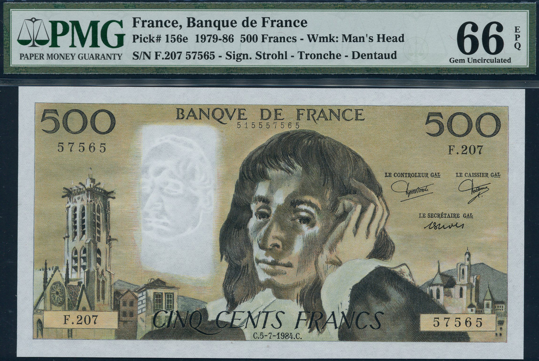 (x) Banque de France, 500 francs, 1984, serial number F.207 57565, olive green, Blaise Pascal at centre, Tower of St Jacques at left, 50 francs, ND (1994), serial number J016179468, blue and green, Antoine de Saint-Exupery at centre left, reverse, biplane