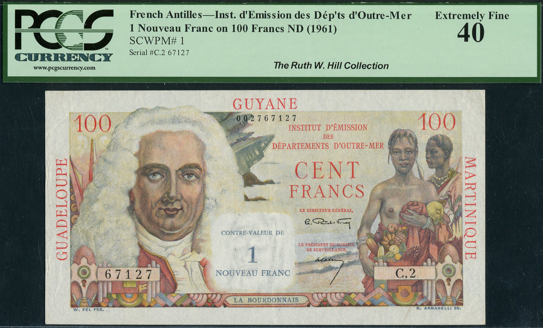 (x) Institut d'Emission des Departments d'Outre-Mer, French Antilles, 1 nouveau franc on 100 francs, ND (1961), serial number C.2 67127, red and multicolour, La Bourdonnais at left, women at right, GUADELOUPE, GUYANE and MARTINIQUE overprint in border, reverse, landscape scene