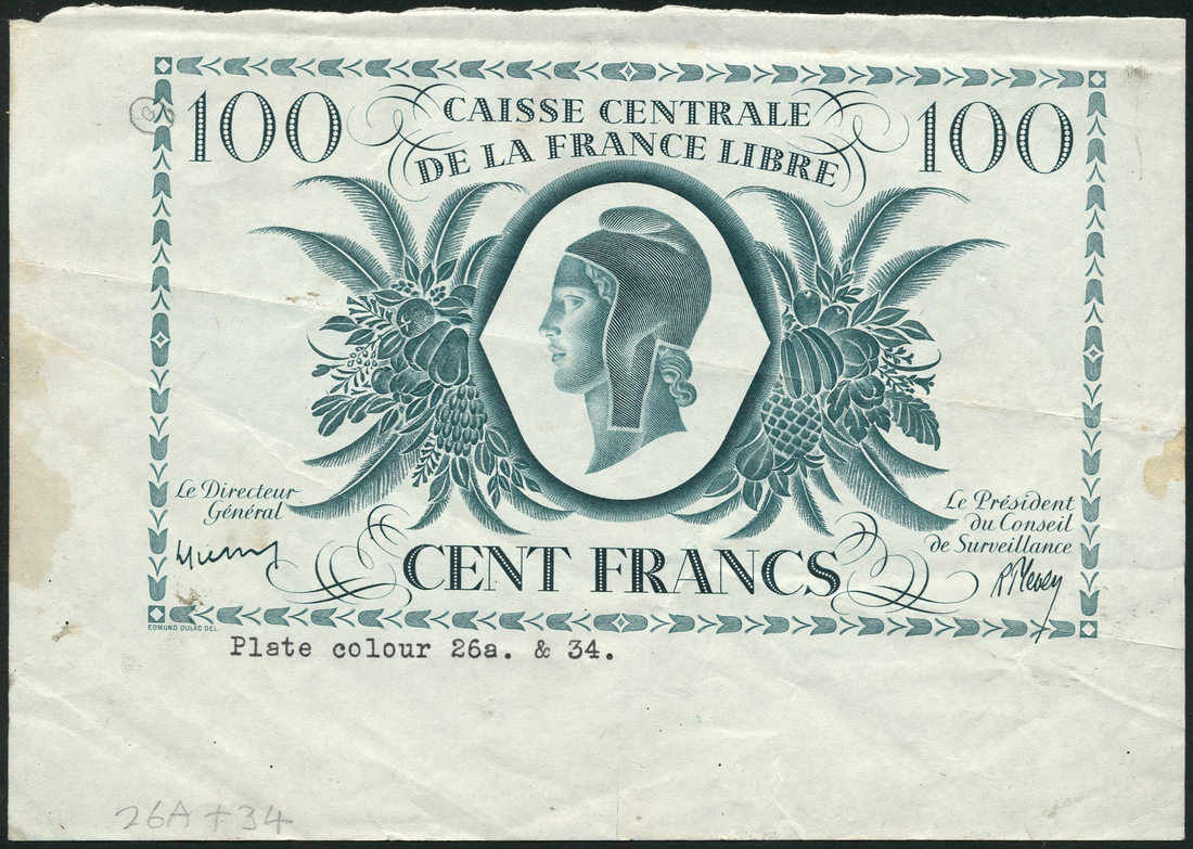Caisse Centrale de la France Libre, a obverse proof colour trial 100 francs, ND (1944), green print, head of Marianne at centre, value at top left and right