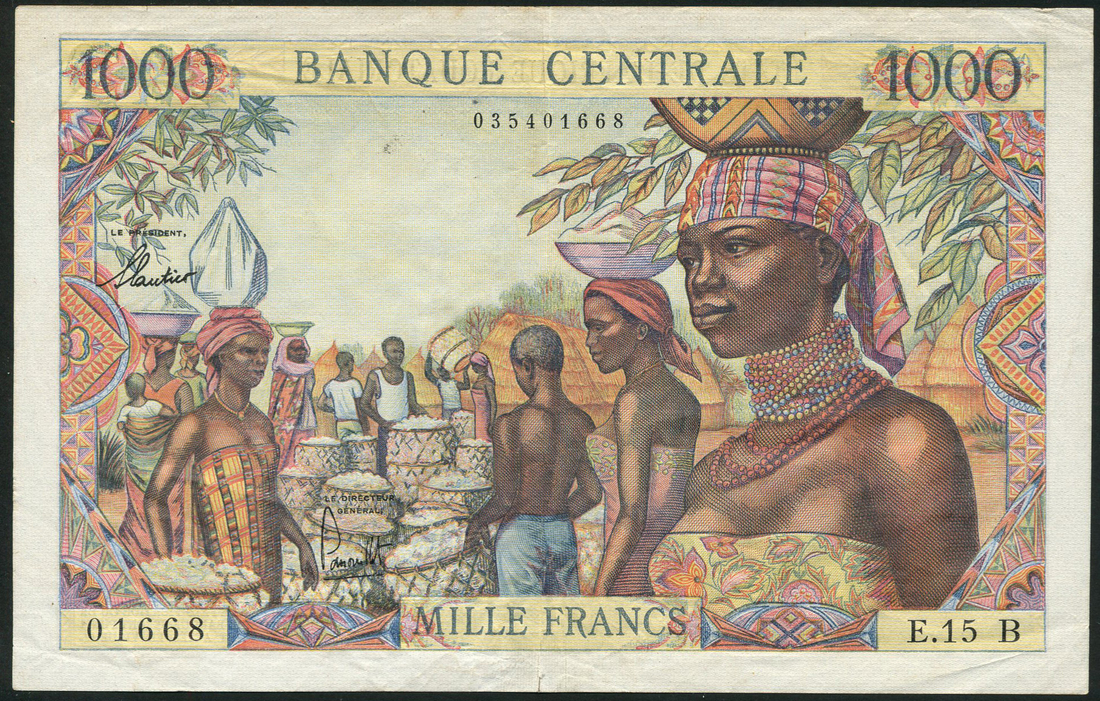 (x) Banque Centrale Etats de l'Afrique Equatoriale, 1000 francs, ND (1963), serial number E.15 01668, multicolour, cotton gathering scene, value at top left and right and low centre, reverse, men logging