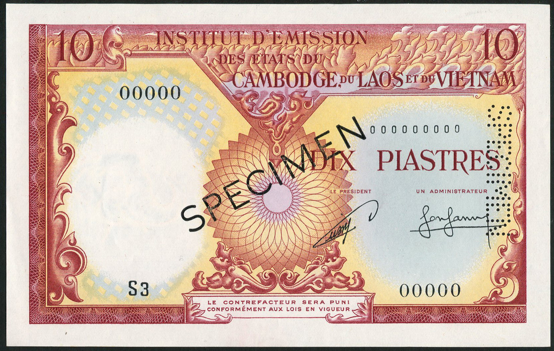 (†) Institut d'Emission des Etats du Cambodge, du Laos at du Vietnam, Cambodia Issue, specimen 1 Piastre = 1 Riel (2), ND (1954), both prefix A1, zero serials, blue and green, three species of tall trees, forest in background, reverse royal houseboat; also specimen 10 Piastres = 10 Riels (2), ND (1953), both prefix S3, zero serials, signature 18, red-brown, yellow and grey, stylised sunburst at centre, reverse two dancers, the first and third perforated CANCELLED, the second overprinted SPECIMEN in red with two De La Rue specimen ovals, the fourth overprinted SPECIMEN in black, perforated SPECIMEN