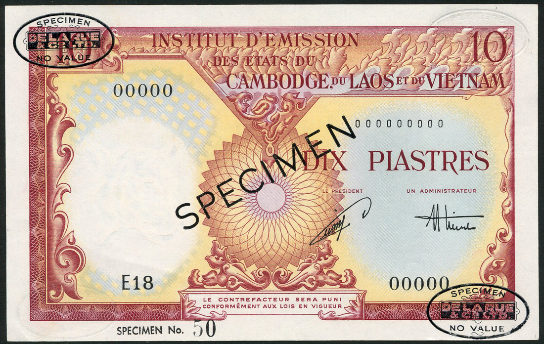 (†) Institut d'Emission des Etats du Cambodge, du Laos at du Vietnam, Vietnam Issue, specimen 1 Piastre = 1 Dong (2), ND (1954), prefix A1 and prefix K42, zero serials, blue and green, three species of tall trees, forest in background, reverse chinze; also specimen 10 Piastres = 10 Dong (3), ND (1953), the first prefix A, the second prefix E24, the third prefix E18, zero serials, red-brown, yellow and grey, stylised sunburst at centre, reverse rock in Halong Bay, the first overprinted SPECIMEN in red, the third and fifth overprinted SPECIMEN in black, the first and third with two red De La Rue specimen ovals, the fifth with two black De La Rue specimen ovals, the second and fourth perforated CANCELLED